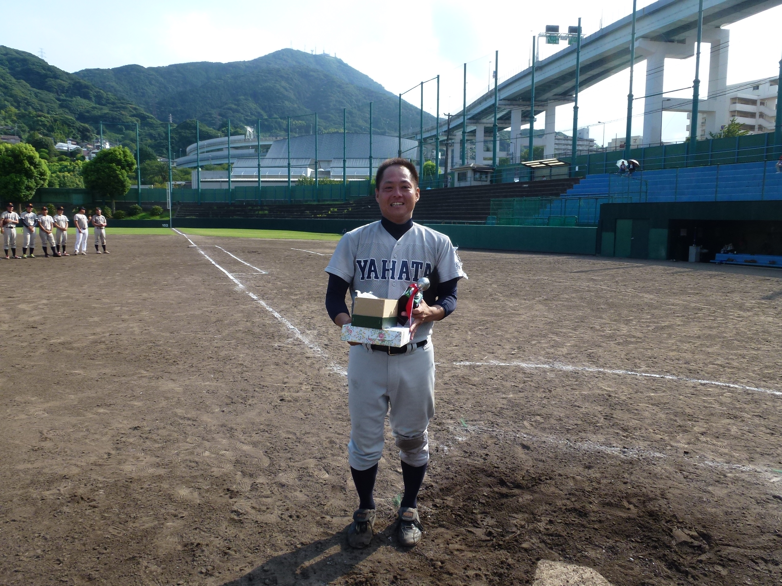 最高殊勲選手賞の有島さん 八幡高校OB 歓喜の胴上げ
